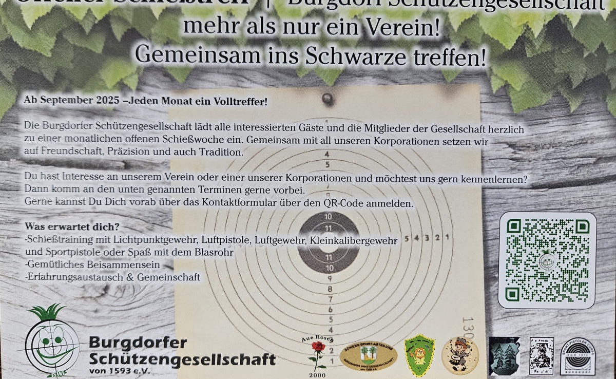 Erfahren Sie auf diesen Seiten (fast) alles rund um das Schützenleben in Burgdorf und die Burgdorfer Schützengesellschaft von 1593