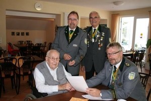 Eine 60jährige Mitgliedschaft ist schon eine besondere Auszeichnung und deshalb ließen es sich Jörg Hoppe, Urs-Uwe Simanowsky und Josef (Jupp) Gürth nicht nehmen, den 97jährige Schützenbruder Gustav Happeck im Seniorenheim Helenenhof in Burgdorf zu besuchen und besonders zu ehren. Happeck bekam von den drei Schützen deshalb die goldene Treuenadel und eine Urkunde überreicht.